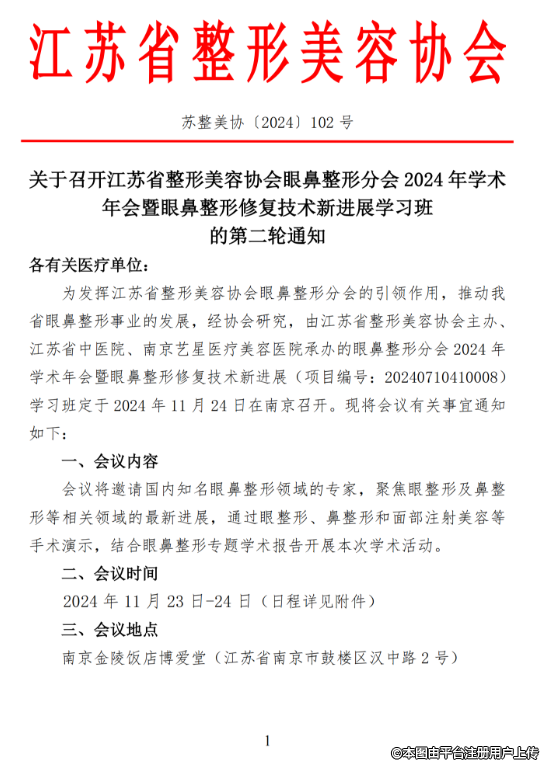 關于召開江蘇省整形美容協(xié)會眼鼻整形分會2024年學術年會暨眼鼻整形修復技術新進展學習班的第二輪通知