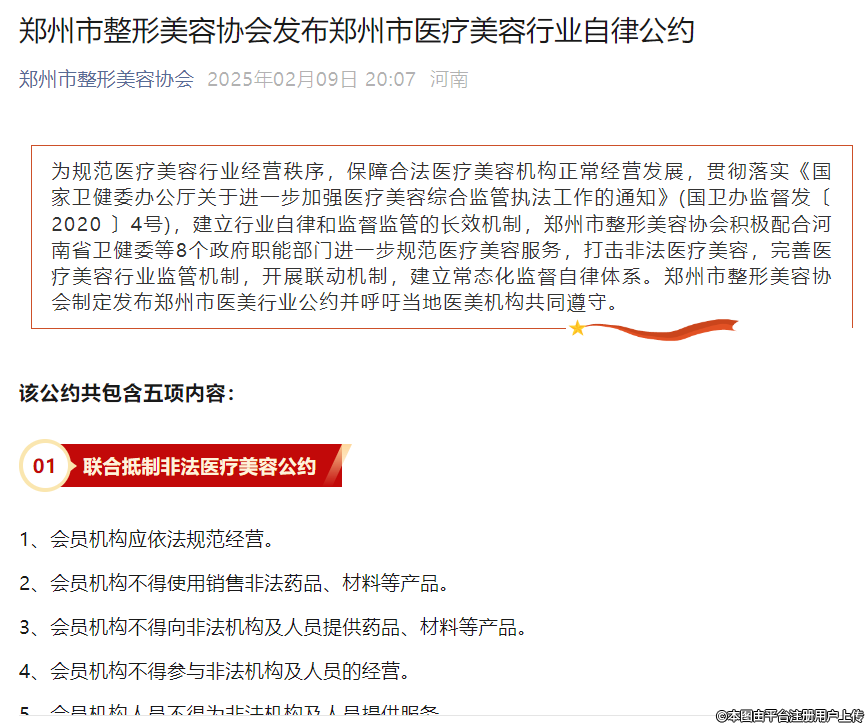 近日,鄭州市整形美容協(xié)會(huì)制定發(fā)布鄭州市醫(yī)美行業(yè)公約并呼吁當(dāng)?shù)蒯t(yī)美機(jī)構(gòu)共同遵守。該公約共包含五項(xiàng)內(nèi)容: