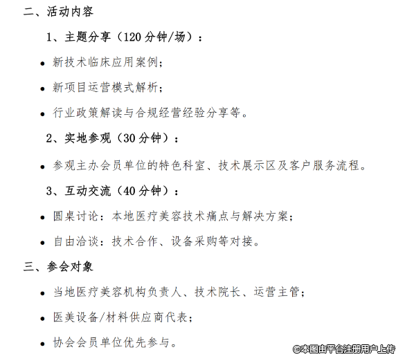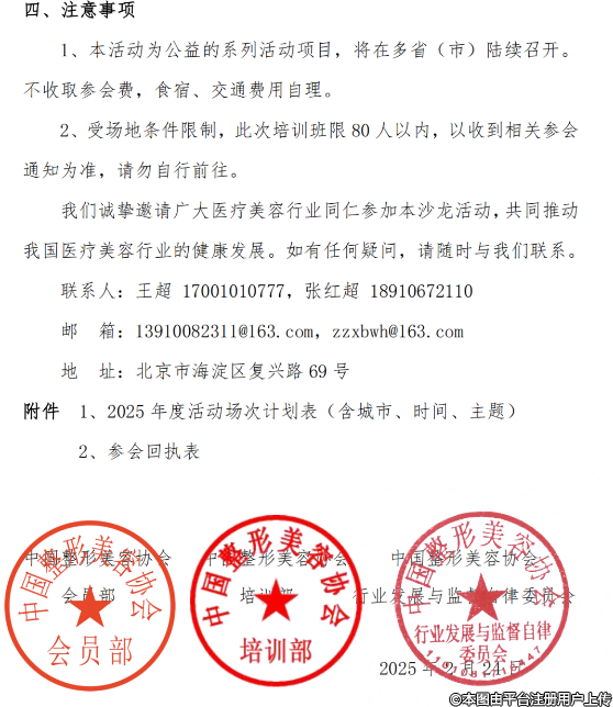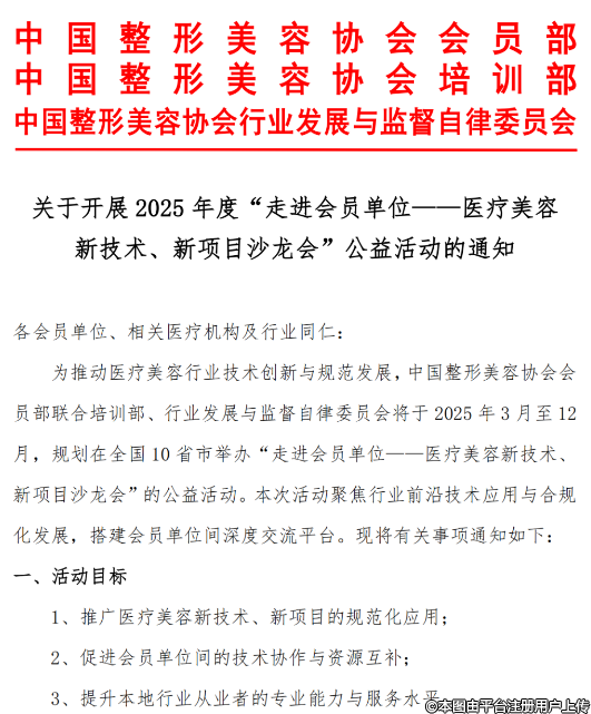 各會員單位、相關(guān)醫(yī)療機(jī)構(gòu)及行業(yè)同仁:為推動醫(yī)療美容行業(yè)技術(shù)創(chuàng)新與規(guī)范發(fā)展,中國整形美容協(xié)會會員部聯(lián)合培訓(xùn)部、行業(yè)發(fā)展與監(jiān)督自律委員會將于2025年3月至12月,規(guī)劃在全國10省市舉辦“走進(jìn)會員單位--醫(yī)療美容新技術(shù)、新項(xiàng)目沙龍會”的公益活動。本次活動聚焦行業(yè)前沿技術(shù)應(yīng)用與合規(guī)化發(fā)展,搭建會員單位間深度交流平臺?,F(xiàn)將有關(guān)事項(xiàng)通知如下: