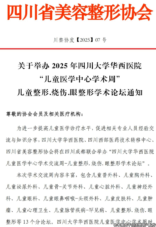 關(guān)于舉辦2025年四川大學(xué)華西醫(yī)院“兒童醫(yī)學(xué)中心學(xué)術(shù)周兒童整形.燒傷.眼整形學(xué)術(shù)論壇通知