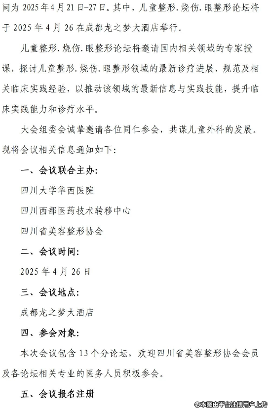 間為 2025年4月21日-27日。其中,兒童整形.燒傷.眼整形論壇將于2025年4月26 在成都龍之夢大酒店舉行。