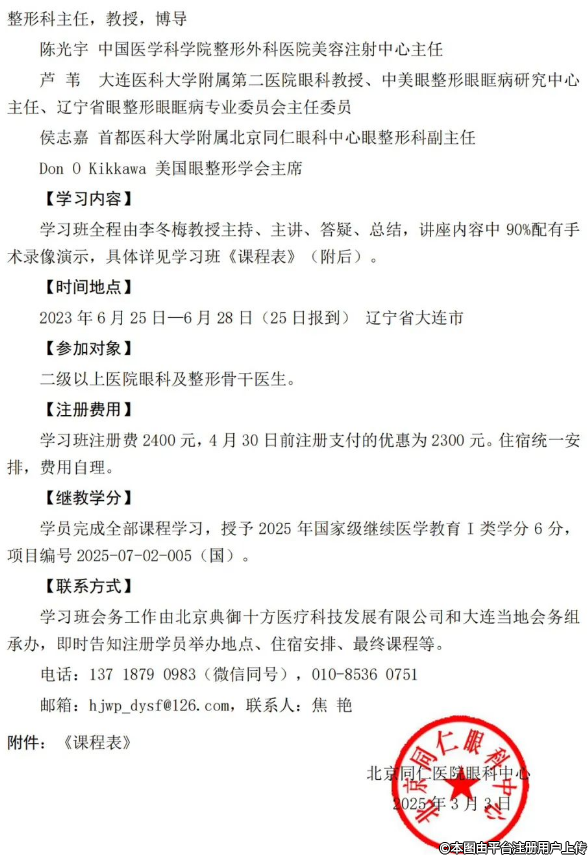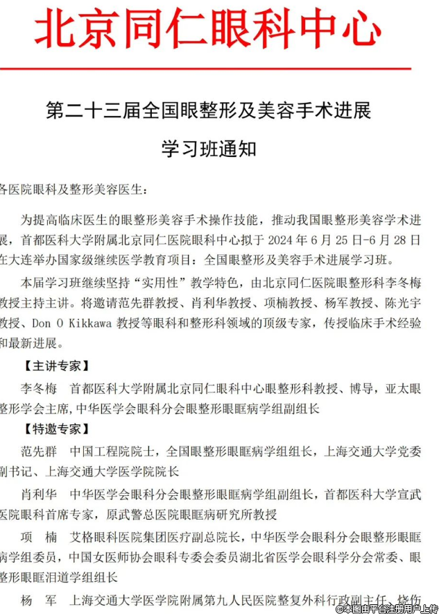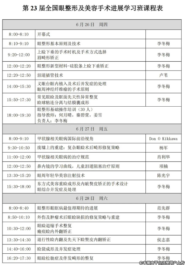 第二十三屆全國眼整形及美容手術進展 學習班通知(附課程表)