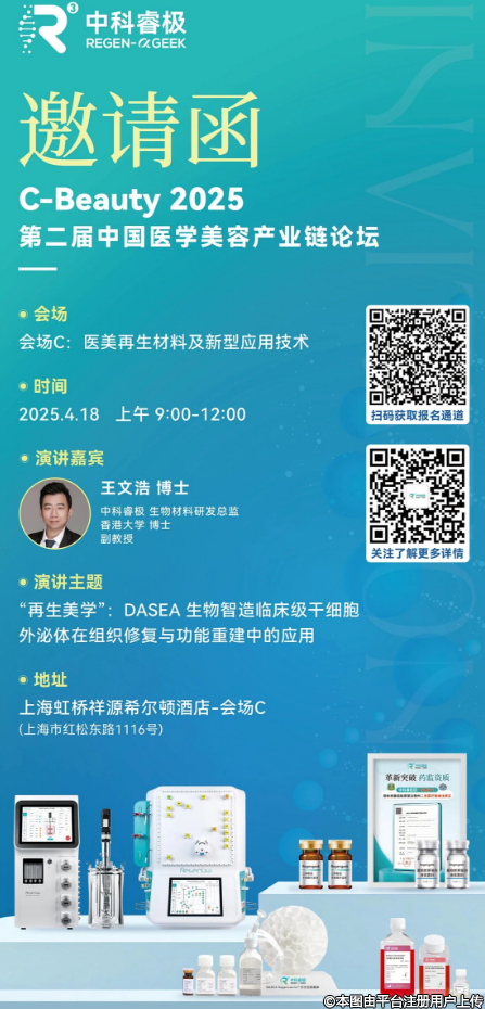 2025年4月17-18日,C-Beauty 2025 第二屆中國醫(yī)學美容產(chǎn)業(yè)鏈論壇將在上海盛大召開,作為中國細胞與基因治療產(chǎn)業(yè)(CGT)上游干細胞培養(yǎng)解決方案的龍頭企業(yè)應(yīng)邀參加本次大會,中科睿極生物材料研發(fā)總監(jiān)、副教授王文浩博士將于4月18日在會場C作《“再生美學”:DASEA生物智造臨床級干細胞外泌體在組織修復與功能重建中的應(yīng)用》的學術(shù)報告。