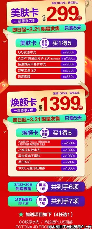 超值¥299美膚卡、¥1399煥顏卡