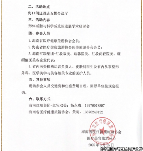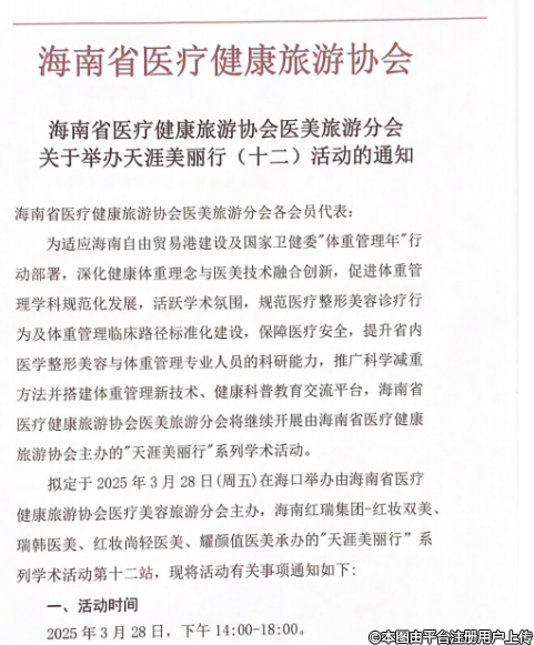 擬定于2025年3月28日(周五)在??谂e辦由海南省醫(yī)療健康旅游協(xié)會(huì)醫(yī)療美容旅游分會(huì)主辦,海南紅瑞集團(tuán)-紅妝雙美瑞韓醫(yī)美、紅妝尚輕醫(yī)美、耀顏值醫(yī)美承辦的"天涯美麗行”系列學(xué)術(shù)活動(dòng)第十二站,現(xiàn)將活動(dòng)有關(guān)事項(xiàng)通知如下: