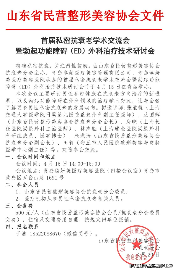 精準私密抗衰,關注兩性健康。由山東省民營整形美容協(xié)會抗衰老分會主辦,青島卓顏醫(yī)療美容管理有限公司、青島瑧妍美醫(yī)療美容醫(yī)院承辦的首屆私密抗衰老學術交流會暨勃起功能障礙(ED)外科治療技術研討會將于4月15日在青島舉辦。