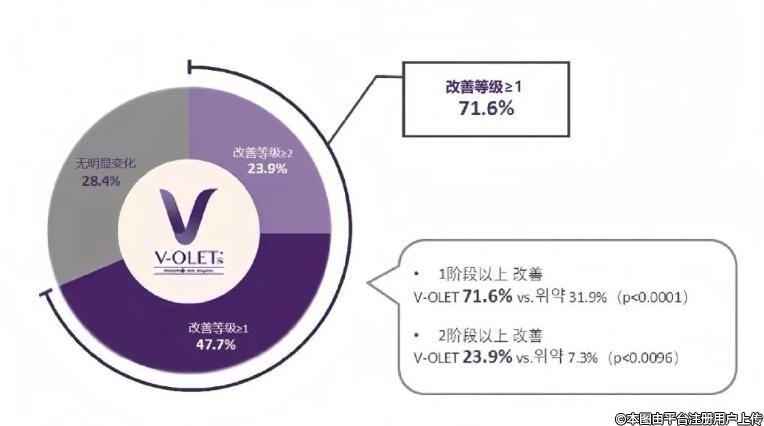 此外,V-OLET溶脂針具備完整臨床實(shí)驗(yàn)數(shù)據(jù)和上市后監(jiān)測(cè)數(shù)據(jù)以及具備顯著的統(tǒng)計(jì)學(xué)意義的臨床安全性和臨床有效性數(shù)據(jù)。V-OLET溶脂針共計(jì)完成4項(xiàng)臨床試驗(yàn)(I期/II期/III期/PMS),總臨床試驗(yàn)人數(shù)超過960人,其中71.6%的受試者頦下脂肪(SMF)得到1個(gè)等級(jí)以上的明顯改善。