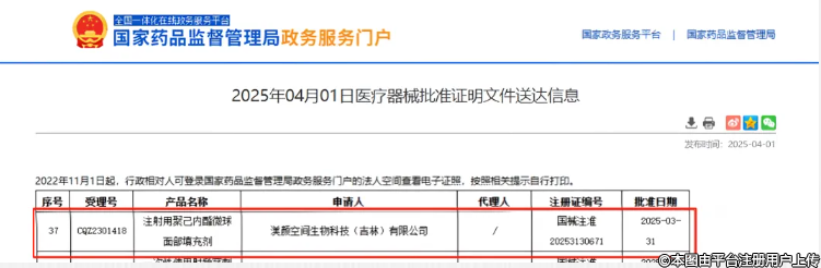 ▲渼顏空間旗下“注射用聚己內(nèi)酯微球面部填充劑”正式獲得NMPA批準(圖源:NMPA)