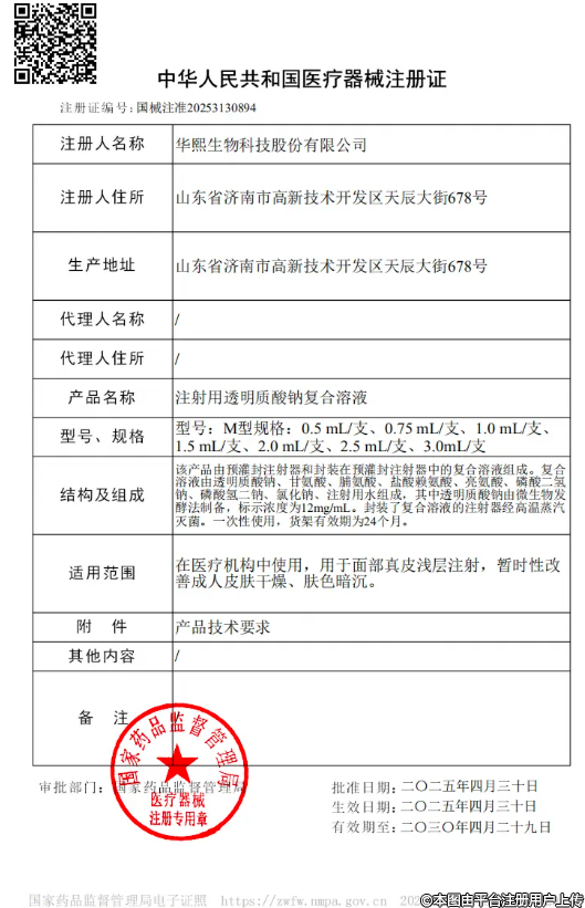 近日,繼"潤百顏·玻玻"Ⅲ類醫(yī)療器械注冊證獲批后僅一周,華熙生物再傳捷報,其自主研發(fā)的“注射用透明質(zhì)酸鈉復(fù)合溶液-M型”(商品名:潤致·緹透)正式斬獲由NMPA頒發(fā)的Ⅲ類醫(yī)療器械注冊證,注冊證號為國械注準20253130894。