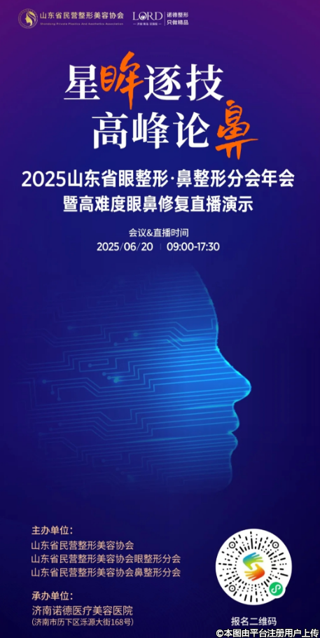 茲定于6月20日(周五)在濟(jì)南召開2025山東省眼整形、鼻整形分會(huì)年會(huì)暨高難度眼鼻修復(fù)直播演示。會(huì)議主題為星【眸】逐技·高峰論【鼻】。致力于眼、鼻整形學(xué)術(shù)專業(yè)交流,囊括眼周黃金美學(xué)審美交流、鼻部手術(shù)設(shè)計(jì)、眼鼻整形高難度手術(shù)修復(fù)實(shí)操演示等,致力于分享眼鼻整形新技術(shù)、新方法、新理念,加強(qiáng)行業(yè)內(nèi)的交流與合作,提高醫(yī)美從業(yè)者的專業(yè)水平,推動(dòng)山東省醫(yī)美行業(yè)的健康發(fā)展。本次會(huì)議由山東省民營(yíng)整形美容協(xié)會(huì)眼整形分會(huì)、山東省民營(yíng)整形美容協(xié)會(huì)鼻整形分會(huì)主辦,濟(jì)南諾德醫(yī)療美容醫(yī)院承辦。