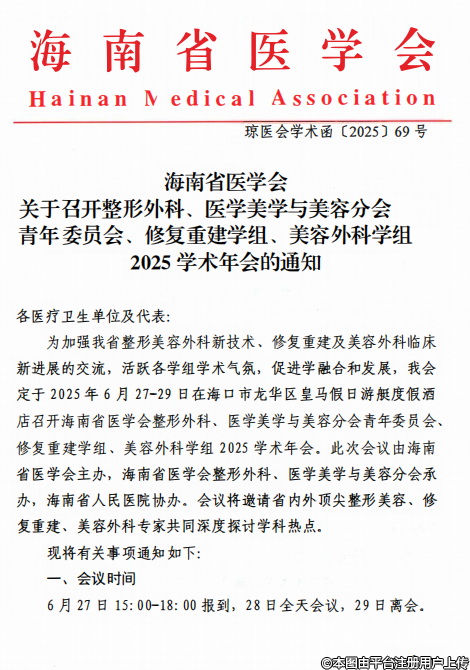 海南省醫(yī)學(xué)會(huì) 關(guān)于召開整形外科、 醫(yī)學(xué)美學(xué)與美容分會(huì)青年委員會(huì)、 修 復(fù)重建學(xué)組、美容外科學(xué)組 2025學(xué) 術(shù)年會(huì)的通知