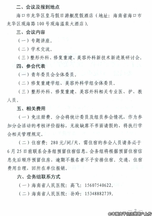(二)住宿費(fèi):280元/間/天,需住宿的參會(huì)人員請(qǐng)務(wù)必于6月25日前聯(lián)系會(huì)務(wù)組預(yù)留住宿信息,會(huì)務(wù)組將根據(jù)預(yù)留住宿信息先后順序預(yù)留住房,逾期不報(bào)名者不予安排住宿。交通、住宿費(fèi)用自理,回所在單位報(bào)銷。