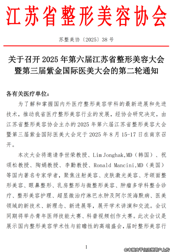 關(guān)于召開 2025年第六屆江蘇省整形美容大會暨第三屆紫金國際醫(yī)美大會的第二輪通知