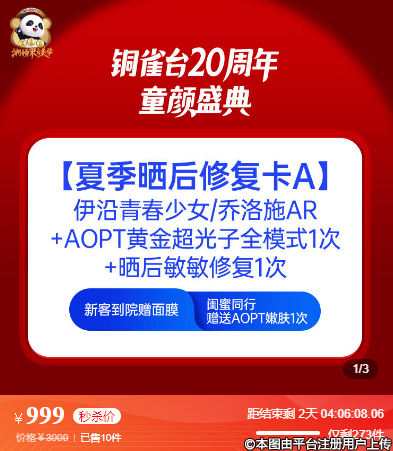 重慶新銅雀臺(tái)超值20周年慶特惠,夏季曬后修復(fù)卡A,999元,讓你輕松不怕太陽(yáng)曬傷!秀自己身材
