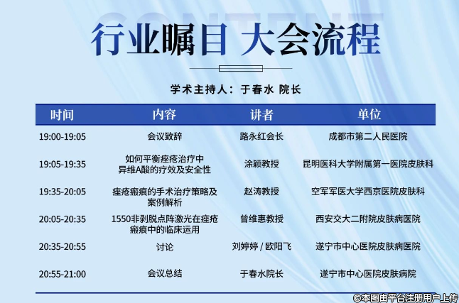 首頁 // 醫(yī)美會(huì)議 // 痤瘡與痤瘡瘢痕學(xué)術(shù)交流會(huì).四川省美容整形協(xié)會(huì)皮膚分會(huì)第三十二期線上學(xué)術(shù)交流會(huì)議