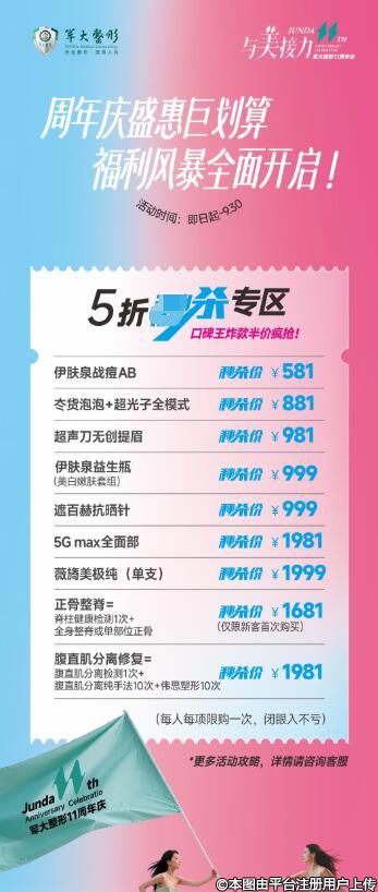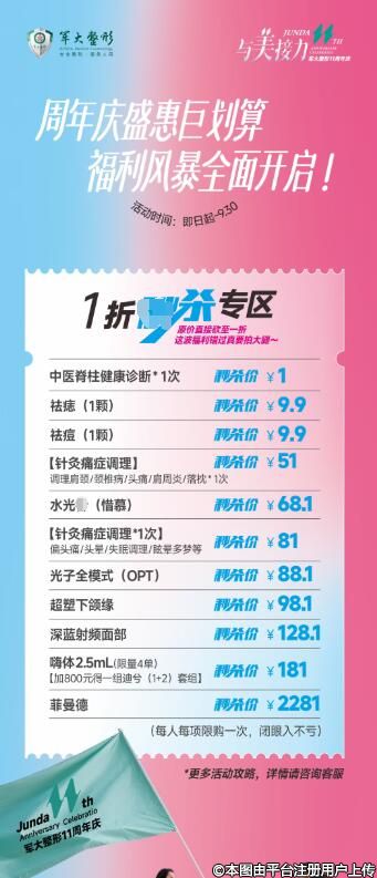 價(jià)格為什么如此美麗?答案就在軍大周年慶!周年慶一折專區(qū),精選項(xiàng)目低至冰點(diǎn)價(jià),祛痘祛痣、光子全模式、超塑下頜緣...只需1元起,美麗蛻變不再是夢!限購一次,把握機(jī)會(huì),讓美麗觸手可及。