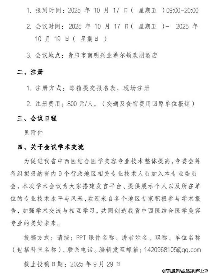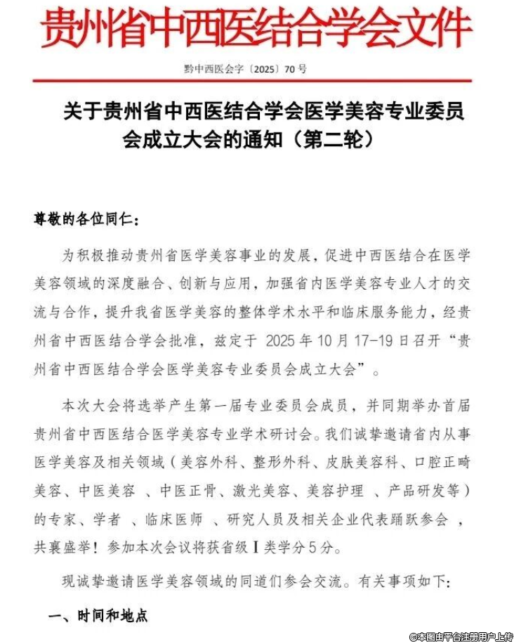 貴州省中西醫(yī)結(jié)合學(xué)會醫(yī)學(xué)美容專業(yè)委員會成立大會擬于2025年10月17-19日在貴陽召開