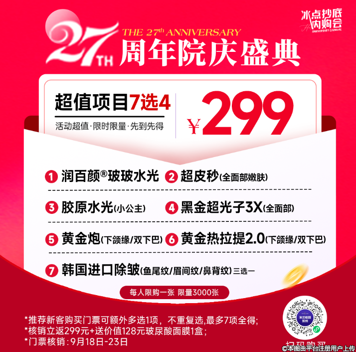 米蘭柏羽集美27周年慶重磅來(lái)襲,【冰點(diǎn)抄底內(nèi)購(gòu)會(huì)】,0元卡感恩巨獻(xiàn),299元任選四項(xiàng)價(jià)值千元爆款項(xiàng)目,轉(zhuǎn)介可多選,核銷立返299元,等于爆款項(xiàng)目免費(fèi)送。