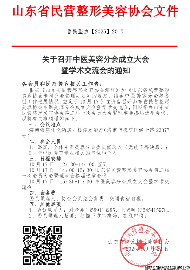 10月17日 14:00-15:30 山東省民營整形美容協(xié)會第二屆一次會員大會暨理事會換屆選舉會議
