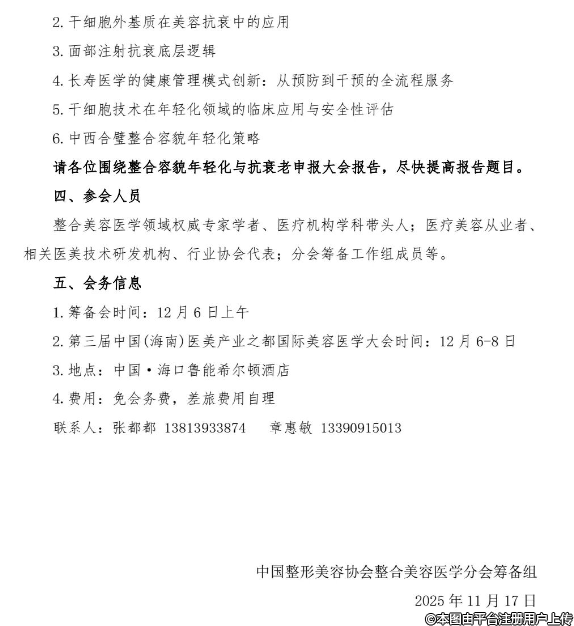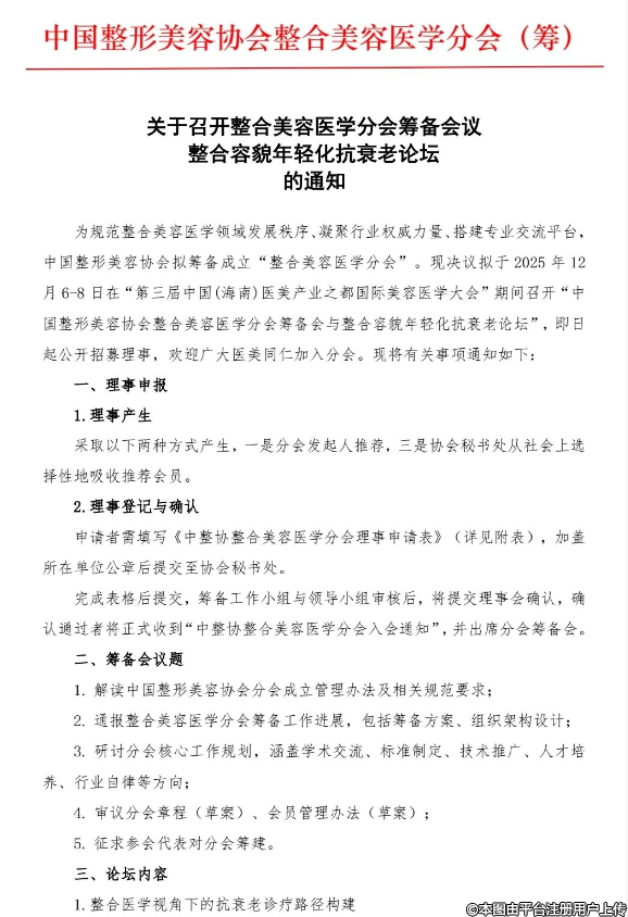 “中國整形美容協(xié)會整合美容醫(yī)學(xué)分會籌備會暨整合容貌年輕化抗衰老論壇”——本次活動是中國醫(yī)學(xué)多學(xué)科整合趨勢,匯聚醫(yī)美領(lǐng)域?qū)<遗c同仁,一方面研討整合美容醫(yī)學(xué)分會的建設(shè)規(guī)劃、行業(yè)標(biāo)準(zhǔn)制定及人才培養(yǎng)等核心議題,另一方面圍繞容貌年輕化與抗衰老領(lǐng)域的前沿技術(shù)、臨床實(shí)踐、安全規(guī)范展開交流。