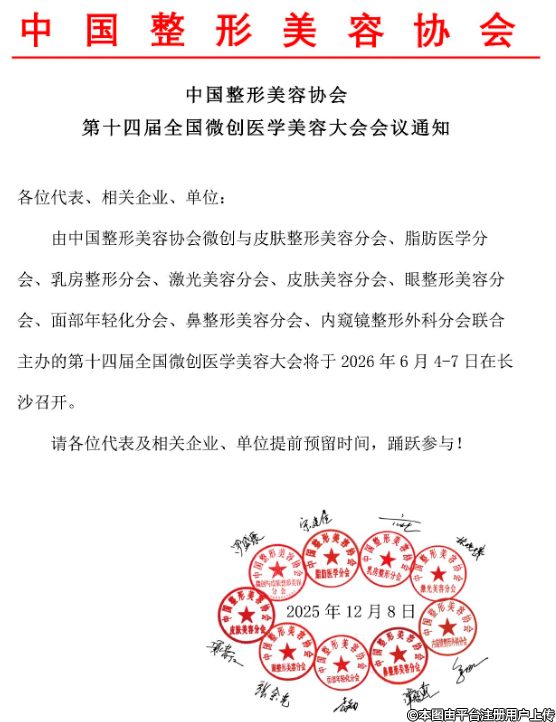 由中國整形美容協(xié)會(huì)微創(chuàng)與皮膚整形美容分會(huì)、脂肪醫(yī)學(xué)分會(huì)、乳房整形分會(huì)、激光美容分會(huì)、皮膚美容分會(huì)、眼整形美容分會(huì)、面部年輕化分會(huì)、鼻整形美容分會(huì)、內(nèi)窺鏡整形外科分會(huì)聯(lián)合主辦的第十四屆全國微創(chuàng)醫(yī)學(xué)美容大會(huì)將于2026年6月4-7日在長沙召開。