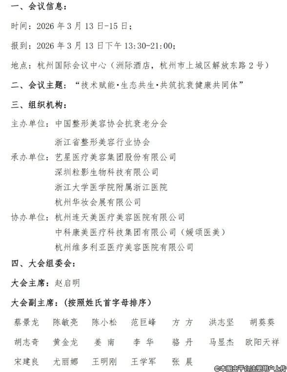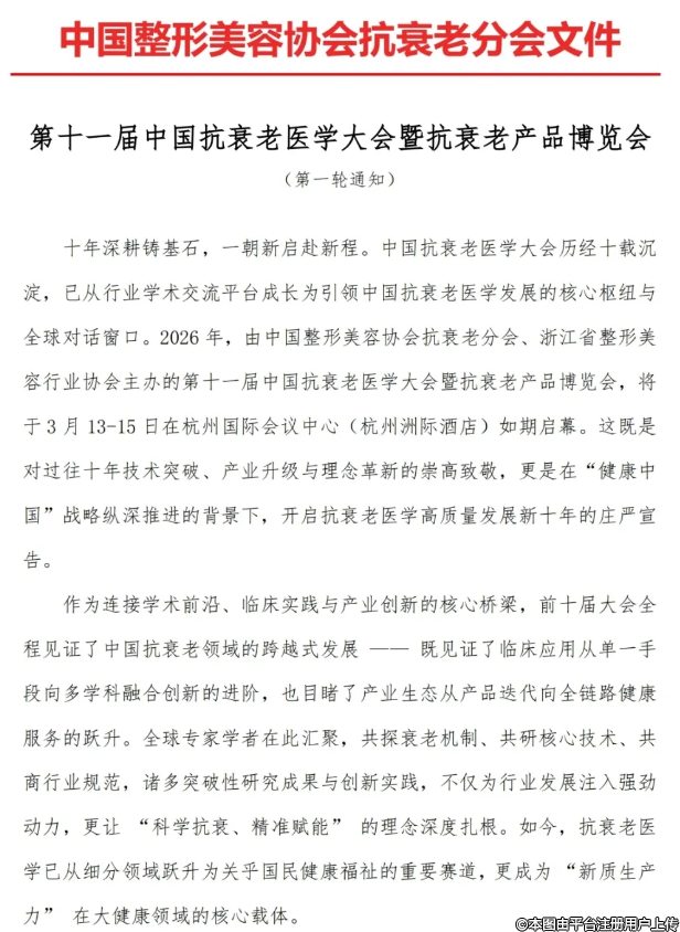 十年深耕鑄基石,一朝新啟赴新程。中國抗衰老醫(yī)學(xué)大會歷經(jīng)十載沉淀,已從行業(yè)學(xué)術(shù)交流平臺成長為引領(lǐng)中國抗衰老醫(yī)學(xué)發(fā)展的核心樞紐與全球?qū)υ挻翱凇?026年,由中國整形美容協(xié)會抗衰老分會、浙江省整形美容行業(yè)協(xié)會主辦的第十一屆中國抗衰老醫(yī)學(xué)大會暨抗衰老產(chǎn)品博覽會,將于3月13-15日在杭州國際會議中心(杭州洲際酒店)如期啟幕。這既是對過往十年技術(shù)突破、產(chǎn)業(yè)升級與理念革新的崇高致敬,更是在"健康中國"戰(zhàn)略縱深推進(jìn)的背景下,開啟抗衰老醫(yī)學(xué)高質(zhì)量發(fā)展新十年的莊嚴(yán)宣告。