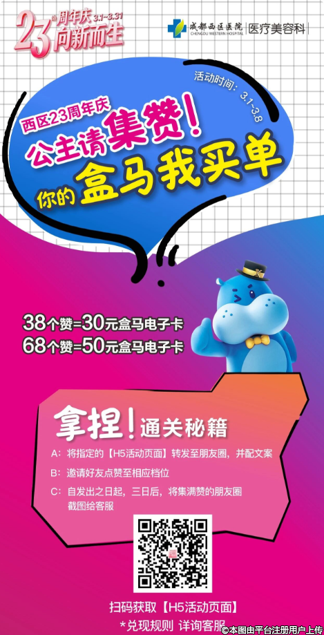 成都西區(qū)美容科23周年慶 寵粉第1波!轉發(fā)H5到朋友圈集贊,送盒馬電子卡