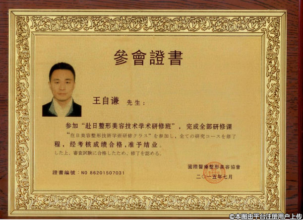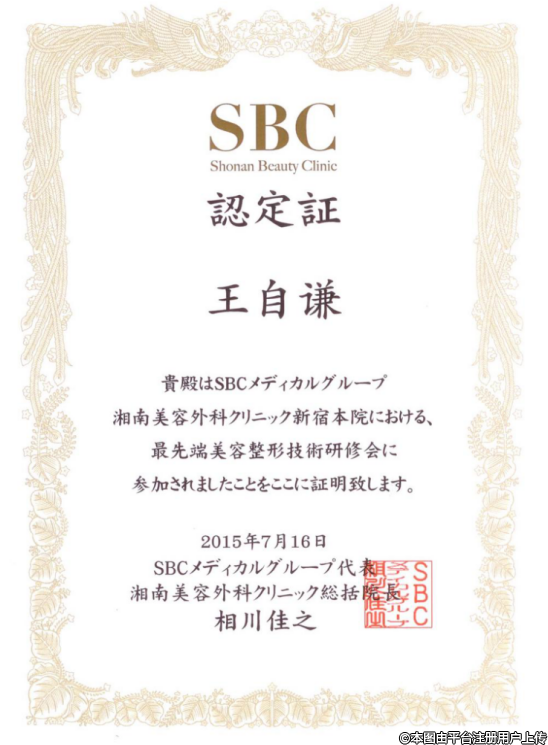2015年,參加PRP+自體脂肪再生醫(yī)學(xué)國際技術(shù)交流大會參加“赴日整形美容技術(shù)學(xué)術(shù)研修班”完成全部研修課程