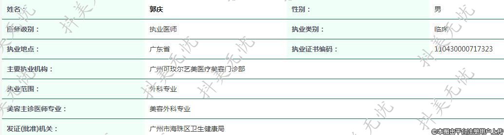 姓名:郭慶性別:男醫(yī)師級別:執(zhí)業(yè)醫(yī)師執(zhí)業(yè)類別:臨床執(zhí)業(yè)地點(diǎn):廣東省執(zhí)業(yè)證書編碼:110430000717323主要執(zhí)業(yè)機(jī)構(gòu):廣州可玫爾藝美醫(yī)療美容門診部執(zhí)業(yè)范圍:口外科專業(yè)美容主診醫(yī)師專業(yè):美容皮膚科專業(yè)發(fā)證(批準(zhǔn))機(jī)關(guān):廣州市海珠區(qū)衛(wèi)生健康局文章內(nèi)容來源:國家衛(wèi)生健康委員會 -