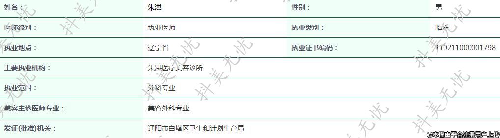 現(xiàn)任遼陽朱洪醫(yī)療美容整形外科醫(yī)師。1984年沈陽醫(yī)學(xué)院畢業(yè),在遼陽市整形外科工作,從事美容整形工作20年,曾任遼陽市中心醫(yī)院美容科醫(yī)師、市整形組醫(yī)師、遼寧省整形學(xué)會委員,曾到北京醫(yī)科大學(xué)三院、協(xié)和醫(yī)院整形外科、上海九院、北京黃寺美容外科醫(yī)院學(xué)習(xí),強(qiáng)項(xiàng):小切口除皺術(shù)、腋窩切口隆胸術(shù)、吸脂減肥術(shù)、綜合治療疤痕術(shù)、三層緊縮陰道緊縮術(shù)、10分鐘處女膜修補(bǔ)術(shù)。