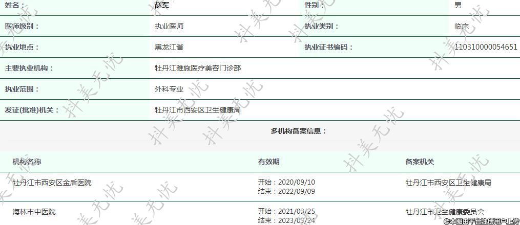 主要執(zhí)業(yè)機構(gòu):牡丹江雅施醫(yī)療美容門診部