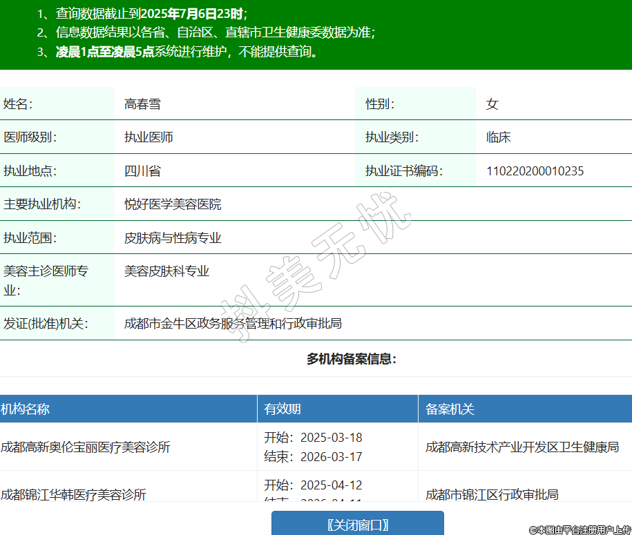 姓名:高春雪性別:女醫(yī)師級別:執(zhí)業(yè)醫(yī)師執(zhí)業(yè)類別:臨床執(zhí)業(yè)地點:四川省執(zhí)業(yè)證書編碼:110220200010235主要執(zhí)業(yè)機構(gòu):悅好醫(yī)學美容醫(yī)院執(zhí)業(yè)范圍:皮膚病與性病專業(yè)美容主診醫(yī)師專業(yè):美容皮膚科專業(yè)發(fā)證(批準)機關(guān):成都市金牛區(qū)政務服務管理和行政審批局多機構(gòu)備案信息:機構(gòu)名稱 有效期 備案機關(guān) 成都高新奧倫寶麗醫(yī)療美容診所 開始:2025-03-18結(jié)束:2026-03-17成都高新技術(shù)產(chǎn)業(yè)開發(fā)區(qū)衛(wèi)生健康局 成都錦江華韓醫(yī)療美容診所 開始:2025-04-12結(jié)束:2026-04-11成都市錦江區(qū)行政審批局 -