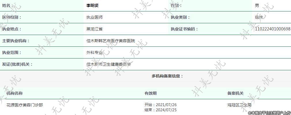 現(xiàn)任佳木斯韓藝來(lái)醫(yī)療美容醫(yī)院執(zhí)業(yè)醫(yī)師