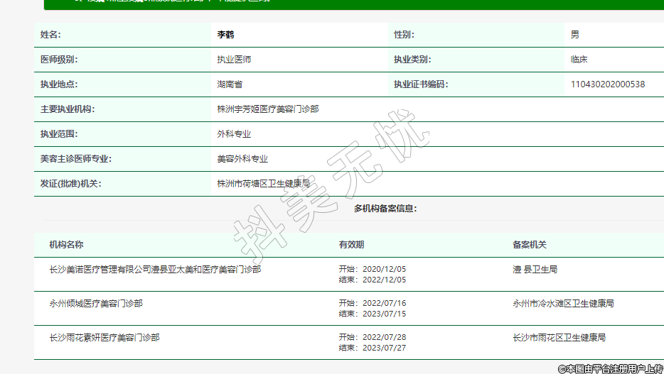 主要執(zhí)業(yè)機(jī)構(gòu):株洲宇芳姬醫(yī)療美容門診部
