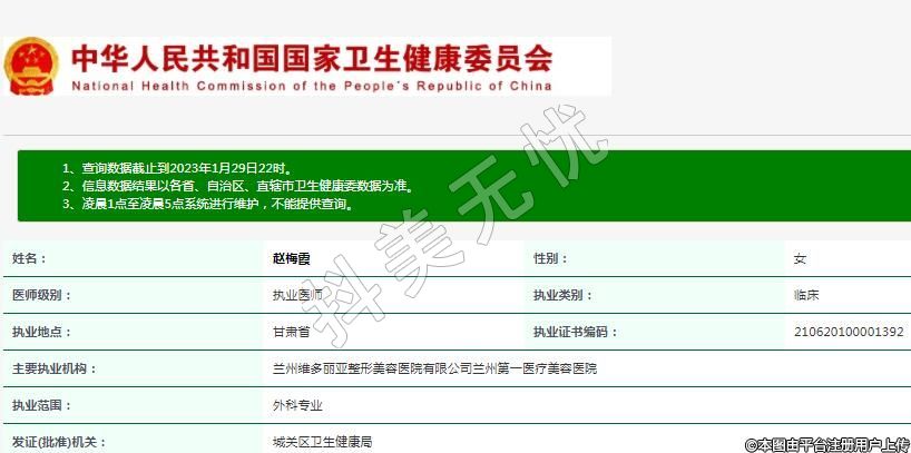 主要執(zhí)業(yè)機(jī)構(gòu):蘭州維多麗亞整形美容醫(yī)院有限公司蘭州第一醫(yī)療美容醫(yī)院