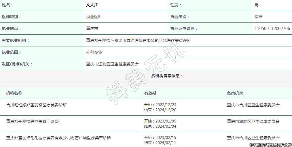 主要執(zhí)業(yè)機(jī)構(gòu):重慶鄭荃麗格芭紋診所管理連鎖有限公司江北醫(yī)療美容診所
