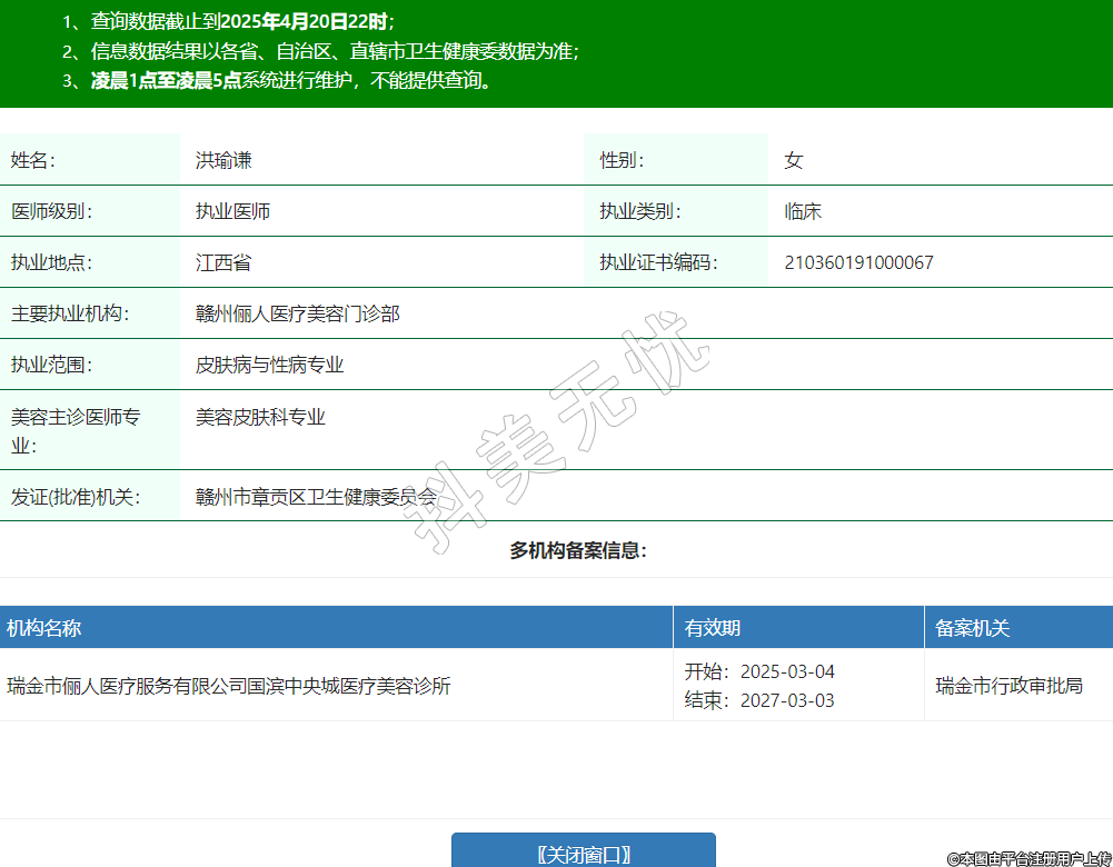姓名:洪瑜謙性別:女醫(yī)師級(jí)別:執(zhí)業(yè)醫(yī)師執(zhí)業(yè)類別:臨床執(zhí)業(yè)地點(diǎn):江西省執(zhí)業(yè)證書編碼:210360191000067主要執(zhí)業(yè)機(jī)構(gòu):贛州儷人醫(yī)療美容門診部執(zhí)業(yè)范圍:皮膚病與性病專業(yè)美容主診醫(yī)師專業(yè):美容皮膚科專業(yè)發(fā)證(批準(zhǔn))機(jī)關(guān):贛州市章貢區(qū)衛(wèi)生健康委員會(huì)多機(jī)構(gòu)備案信息:機(jī)構(gòu)名稱 有效期 備案機(jī)關(guān) 瑞金市儷人醫(yī)療服務(wù)有限公司國(guó)濱中央城醫(yī)療美容診所 開(kāi)始:2025-03-04結(jié)束:2027-03-03瑞金市行政審批局 -