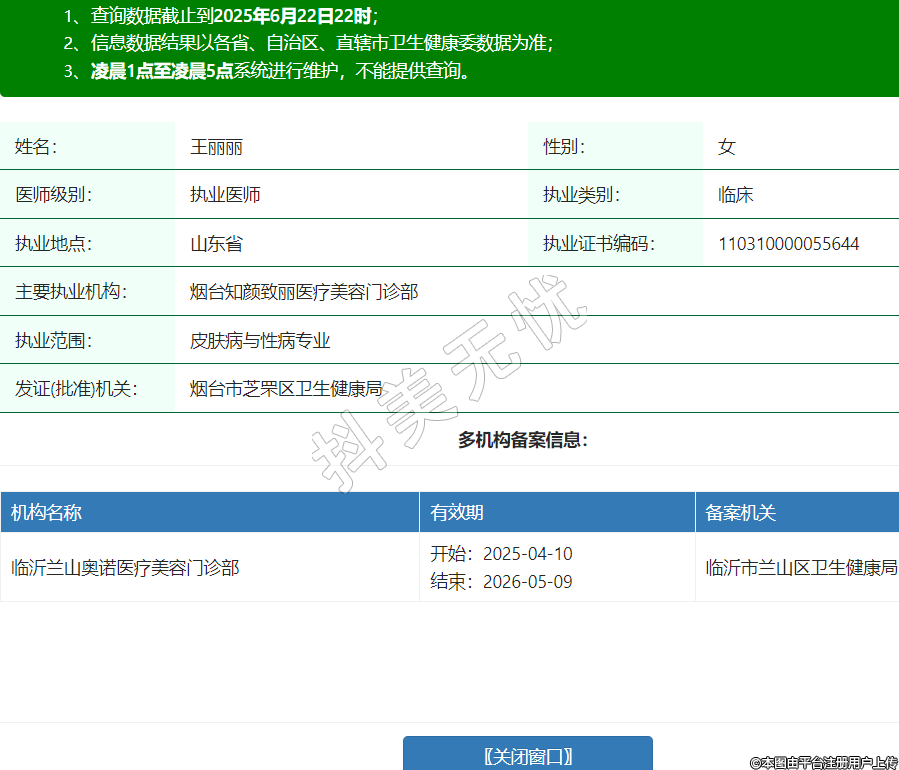 姓名:王麗麗性別:女醫(yī)師級別:執(zhí)業(yè)醫(yī)師執(zhí)業(yè)類別:臨床執(zhí)業(yè)地點(diǎn):山東省執(zhí)業(yè)證書編碼:110310000055644主要執(zhí)業(yè)機(jī)構(gòu):煙臺知顏致麗醫(yī)療美容門診部執(zhí)業(yè)范圍:皮膚病與性病專業(yè)發(fā)證(批準(zhǔn))機(jī)關(guān):煙臺市芝罘區(qū)衛(wèi)生健康局多機(jī)構(gòu)備案信息:機(jī)構(gòu)名稱 有效期 備案機(jī)關(guān) 臨沂蘭山奧諾醫(yī)療美容門診部 開始:2025-04-10結(jié)束:2026-05-09臨沂市蘭山區(qū)衛(wèi)生健康局 -