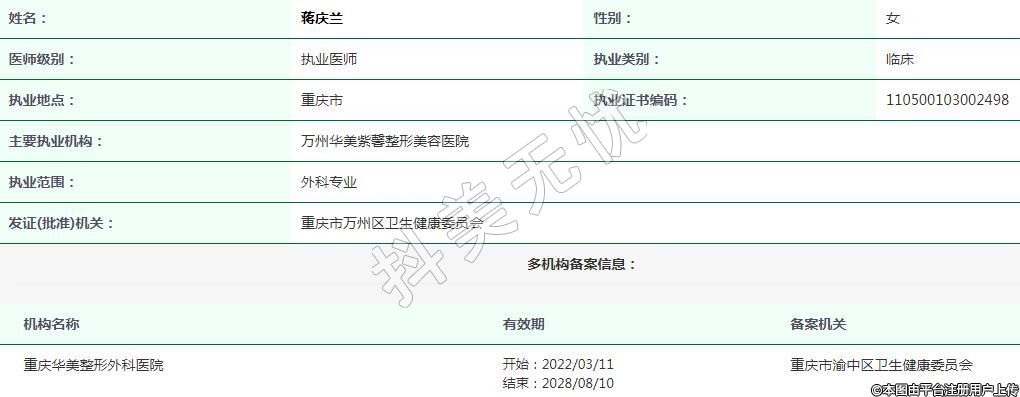 主要執(zhí)業(yè)機(jī)構(gòu):萬州華美紫馨整形美容醫(yī)院