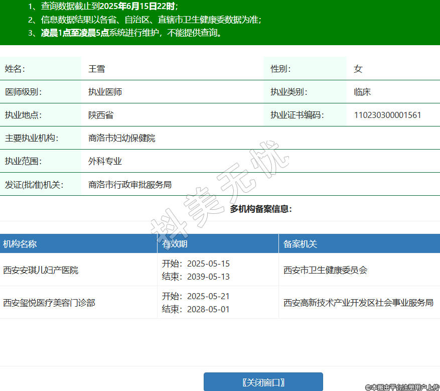 姓名:王雪性別:女醫(yī)師級別:執(zhí)業(yè)醫(yī)師執(zhí)業(yè)類別:臨床執(zhí)業(yè)地點(diǎn):陜西省執(zhí)業(yè)證書編碼:110230300001561主要執(zhí)業(yè)機(jī)構(gòu):商洛市婦幼保健院執(zhí)業(yè)范圍:外科專業(yè)發(fā)證(批準(zhǔn))機(jī)關(guān):商洛市行政審批服務(wù)局多機(jī)構(gòu)備案信息:機(jī)構(gòu)名稱 有效期 備案機(jī)關(guān) 西安安琪兒婦產(chǎn)醫(yī)院 開始:2025-05-15結(jié)束:2039-05-13西安市衛(wèi)生健康委員會(huì) 西安璽悅醫(yī)療美容門診部 開始:2025-05-21結(jié)束:2028-05-01西安高新技術(shù)產(chǎn)業(yè)開發(fā)區(qū)社會(huì)事業(yè)服務(wù)局 -