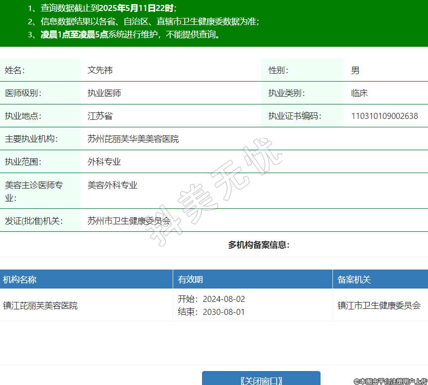 姓名:文先祎性別:男醫(yī)師級別:執(zhí)業(yè)醫(yī)師執(zhí)業(yè)類別:臨床執(zhí)業(yè)地點:江蘇省執(zhí)業(yè)證書編碼:110310109002638主要執(zhí)業(yè)機構(gòu):蘇州芘麗芙華美美容醫(yī)院執(zhí)業(yè)范圍:外科專業(yè)美容主診醫(yī)師專業(yè):美容外科專業(yè)發(fā)證(批準(zhǔn))機關(guān):蘇州市衛(wèi)生健康委員會多機構(gòu)備案信息:機構(gòu)名稱 有效期 備案機關(guān) 鎮(zhèn)江芘麗芙美容醫(yī)院 開始:2024-08-02結(jié)束:2030-08-01鎮(zhèn)江市衛(wèi)生健康委員會 -