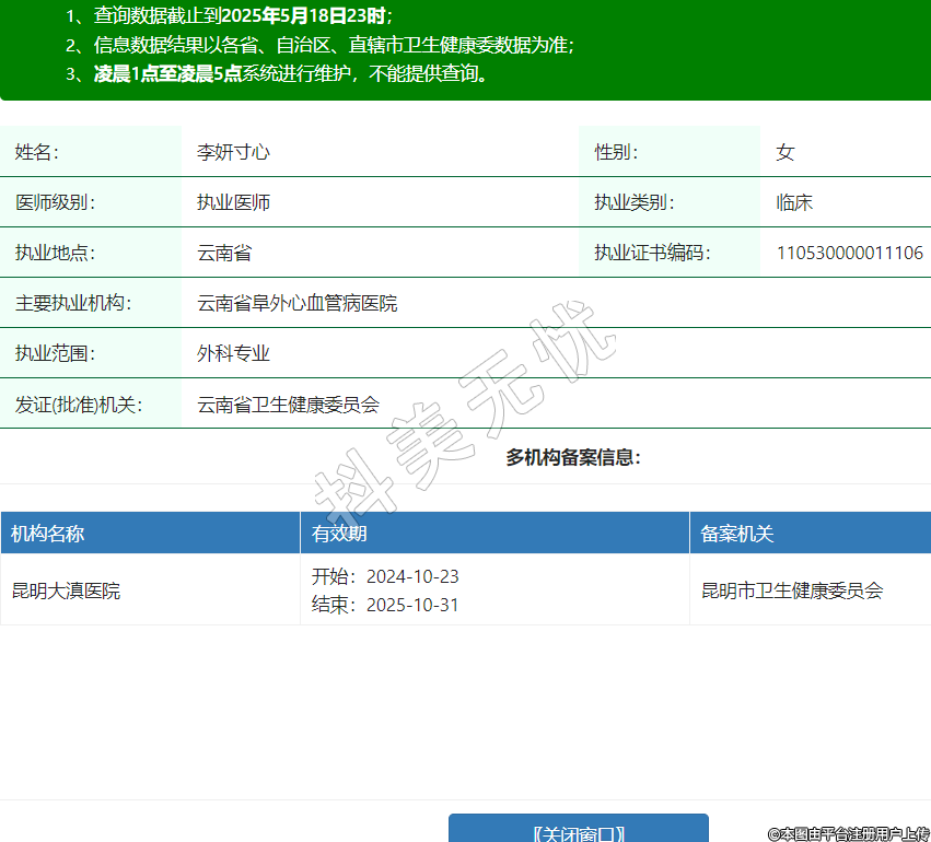 姓名:李妍寸心性別:女醫(yī)師級(jí)別:執(zhí)業(yè)醫(yī)師執(zhí)業(yè)類別:臨床執(zhí)業(yè)地點(diǎn):云南省執(zhí)業(yè)證書編碼:110530000011106主要執(zhí)業(yè)機(jī)構(gòu):云南省阜外心血管病醫(yī)院執(zhí)業(yè)范圍:外科專業(yè)發(fā)證(批準(zhǔn))機(jī)關(guān):云南省衛(wèi)生健康委員會(huì)多機(jī)構(gòu)備案信息:機(jī)構(gòu)名稱 有效期 備案機(jī)關(guān) 昆明大滇醫(yī)院 開始:2024-10-23結(jié)束:2025-10-31昆明市衛(wèi)生健康委員會(huì) -