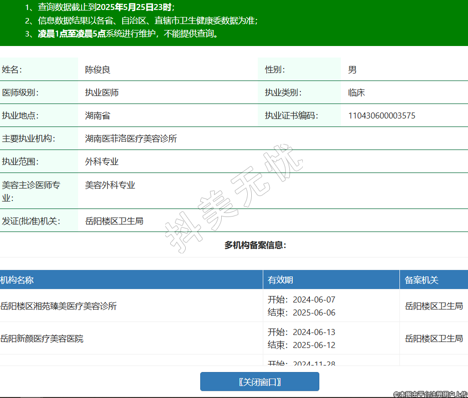 姓名:陳俊良性別:男醫(yī)師級(jí)別:執(zhí)業(yè)醫(yī)師執(zhí)業(yè)類別:臨床執(zhí)業(yè)地點(diǎn):湖南省執(zhí)業(yè)證書(shū)編碼:110430600003575主要執(zhí)業(yè)機(jī)構(gòu):湖南醫(yī)菲洛醫(yī)療美容診所執(zhí)業(yè)范圍:外科專業(yè)美容主診醫(yī)師專業(yè):美容外科專業(yè)發(fā)證(批準(zhǔn))機(jī)關(guān):岳陽(yáng)樓區(qū)衛(wèi)生局多機(jī)構(gòu)備案信息:機(jī)構(gòu)名稱 有效期 備案機(jī)關(guān) 岳陽(yáng)樓區(qū)湘苑臻美醫(yī)療美容診所 開(kāi)始:2024-06-07結(jié)束:2025-06-06岳陽(yáng)樓區(qū)衛(wèi)生局 岳陽(yáng)新顏醫(yī)療美容醫(yī)院 開(kāi)始:2024-06-13結(jié)束:2025-06-12岳陽(yáng)樓區(qū)衛(wèi)生局 昱恩醫(yī)療美容診所 開(kāi)始:2024-11-28結(jié)束:2025-11-27岳陽(yáng)樓區(qū)衛(wèi)生局 岳陽(yáng)市岳陽(yáng)樓區(qū)艾妃爾醫(yī)療美容門(mén)診部 開(kāi)始:2024-12-30結(jié)束:2025-12-29岳陽(yáng)樓區(qū)衛(wèi)生局 岳陽(yáng)芯美醫(yī)療美容診所 開(kāi)始:2025-03-29結(jié)束:2026-03-28岳陽(yáng)樓區(qū)衛(wèi)生局 -