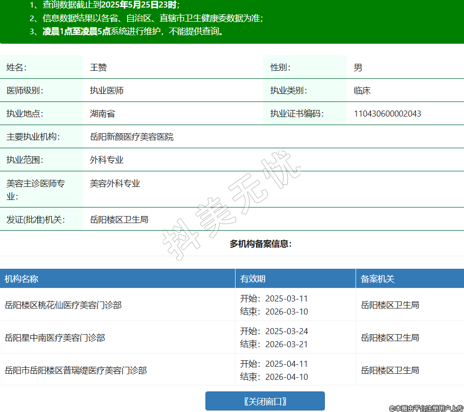 姓名:王贊性別:男醫(yī)師級別:執(zhí)業(yè)醫(yī)師執(zhí)業(yè)類別:臨床執(zhí)業(yè)地點:湖南省執(zhí)業(yè)證書編碼:110430600002043主要執(zhí)業(yè)機構(gòu):岳陽新顏醫(yī)療美容醫(yī)院執(zhí)業(yè)范圍:外科專業(yè)美容主診醫(yī)師專業(yè):美容外科專業(yè)發(fā)證(批準)機關(guān):岳陽樓區(qū)衛(wèi)生局多機構(gòu)備案信息:機構(gòu)名稱 有效期 備案機關(guān) 岳陽樓區(qū)桃花仙醫(yī)療美容門診部 開始:2025-03-11結(jié)束:2026-03-10岳陽樓區(qū)衛(wèi)生局 岳陽星中南醫(yī)療美容門診部 開始:2025-03-24結(jié)束:2026-03-21岳陽樓區(qū)衛(wèi)生局 岳陽市岳陽樓區(qū)普瑞緹醫(yī)療美容門診部 開始:2025-04-11結(jié)束:2026-04-10岳陽樓區(qū)衛(wèi)生局 岳陽市南湖新區(qū)榆梵皙醫(yī)療美容門診部 開始:2025-04-18結(jié)束:2026-04-17岳陽市南湖新區(qū)衛(wèi)生健康局 -