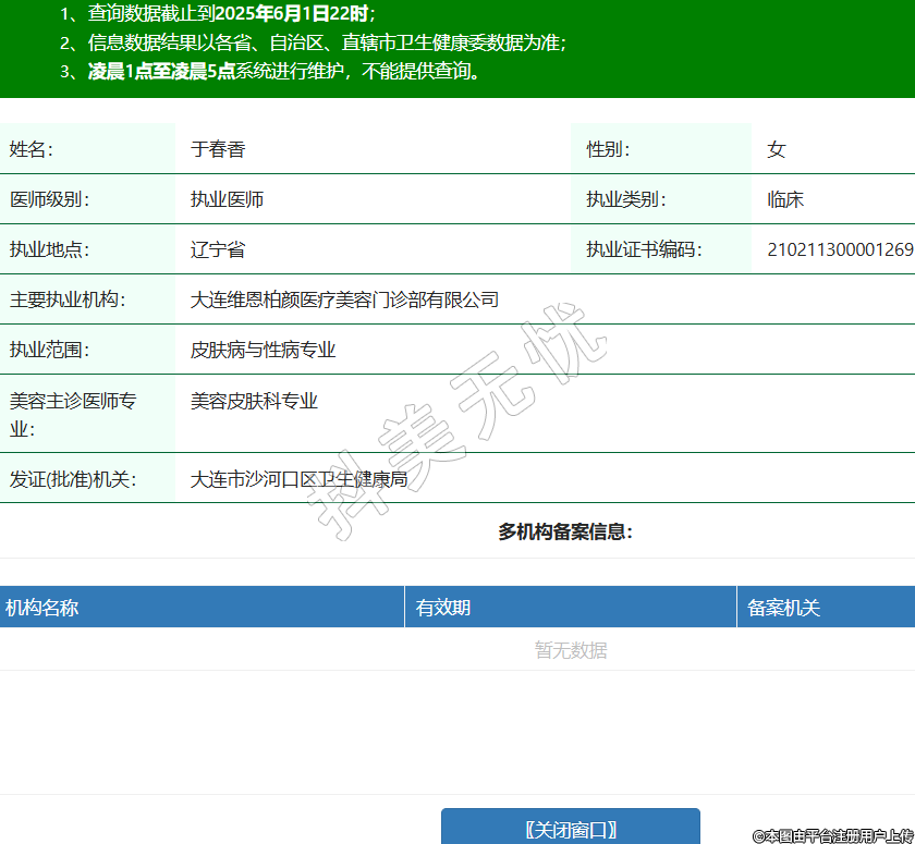 姓名:于春香性別:女醫(yī)師級別:執(zhí)業(yè)醫(yī)師執(zhí)業(yè)類別:臨床執(zhí)業(yè)地點:遼寧省執(zhí)業(yè)證書編碼:210211300001269主要執(zhí)業(yè)機構(gòu):大連維恩柏顏醫(yī)療美容門診部有限公司執(zhí)業(yè)范圍:皮膚病與性病專業(yè)美容主診醫(yī)師專業(yè):美容皮膚科專業(yè)發(fā)證(批準)機關(guān):大連市沙河口區(qū)衛(wèi)生健康局 -