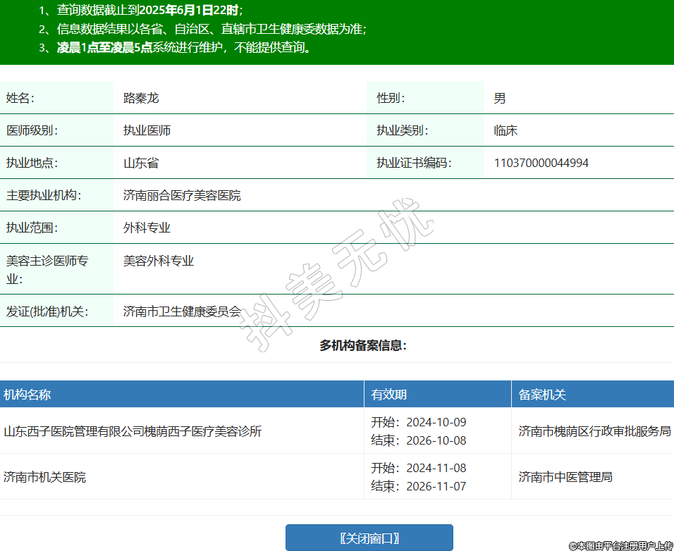 姓名:路秦龍性別:男醫(yī)師級別:執(zhí)業(yè)醫(yī)師執(zhí)業(yè)類別:臨床執(zhí)業(yè)地點:山東省執(zhí)業(yè)證書編碼:110370000044994主要執(zhí)業(yè)機構(gòu):濟南麗合醫(yī)療美容醫(yī)院執(zhí)業(yè)范圍:外科專業(yè)美容主診醫(yī)師專業(yè):美容外科專業(yè)發(fā)證(批準)機關(guān):濟南市衛(wèi)生健康委員會多機構(gòu)備案信息:機構(gòu)名稱 有效期 備案機關(guān) 山東西子醫(yī)院管理有限公司槐蔭西子醫(yī)療美容診所 開始:2024-10-09結(jié)束:2026-10-08濟南市槐蔭區(qū)行政審批服務(wù)局 濟南市機關(guān)醫(yī)院 開始:2024-11-08結(jié)束:2026-11-07濟南市中醫(yī)管理局 -