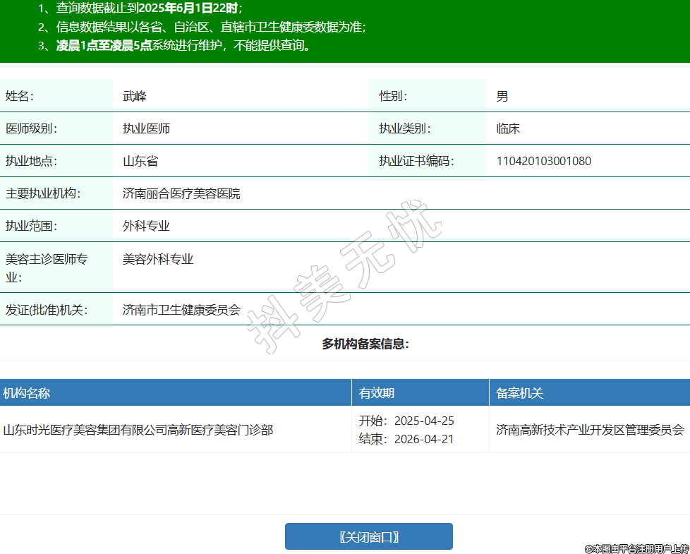 姓名:武峰性別:男醫(yī)師級(jí)別:執(zhí)業(yè)醫(yī)師執(zhí)業(yè)類別:臨床執(zhí)業(yè)地點(diǎn):山東省執(zhí)業(yè)證書(shū)編碼:110420103001080主要執(zhí)業(yè)機(jī)構(gòu):濟(jì)南麗合醫(yī)療美容醫(yī)院執(zhí)業(yè)范圍:外科專業(yè)美容主診醫(yī)師專業(yè):美容外科專業(yè)發(fā)證(批準(zhǔn))機(jī)關(guān):濟(jì)南市衛(wèi)生健康委員會(huì)多機(jī)構(gòu)備案信息:機(jī)構(gòu)名稱 有效期 備案機(jī)關(guān) 山東時(shí)光醫(yī)療美容集團(tuán)有限公司高新醫(yī)療美容門診部 開(kāi)始:2025-04-25結(jié)束:2026-04-21濟(jì)南高新技術(shù)產(chǎn)業(yè)開(kāi)發(fā)區(qū)管理委員會(huì) -
