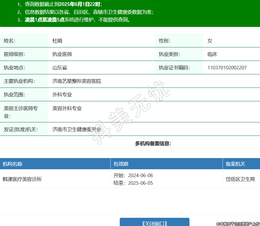 姓名:杜娟性別:女醫(yī)師級別:執(zhí)業(yè)醫(yī)師執(zhí)業(yè)類別:臨床執(zhí)業(yè)地點:山東省執(zhí)業(yè)證書編碼:110370102002207主要執(zhí)業(yè)機構(gòu):濟南藝星整形美容醫(yī)院執(zhí)業(yè)范圍:外科專業(yè)美容主診醫(yī)師專業(yè):美容外科專業(yè)發(fā)證(批準)機關(guān):濟南市衛(wèi)生健康委員會多機構(gòu)備案信息:機構(gòu)名稱 有效期 備案機關(guān) 韓漾醫(yī)療美容診所 開始:2024-06-06結(jié)束:2025-06-05岱岳區(qū)衛(wèi)生局 -