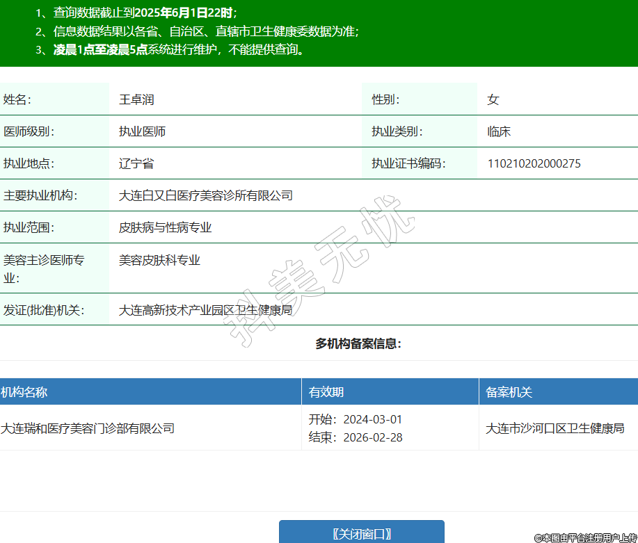 姓名:王卓潤性別:女醫(yī)師級別:執(zhí)業(yè)醫(yī)師執(zhí)業(yè)類別:臨床執(zhí)業(yè)地點:遼寧省執(zhí)業(yè)證書編碼:110210202000275主要執(zhí)業(yè)機構:大連白又白醫(yī)療美容診所有限公司執(zhí)業(yè)范圍:皮膚病與性病專業(yè)美容主診醫(yī)師專業(yè):美容皮膚科專業(yè)發(fā)證(批準)機關:大連高新技術產(chǎn)業(yè)園區(qū)衛(wèi)生健康局多機構備案信息:機構名稱 有效期 備案機關 大連瑞和醫(yī)療美容門診部有限公司 開始:2024-03-01結束:2026-02-28大連市沙河口區(qū)衛(wèi)生健康局 -