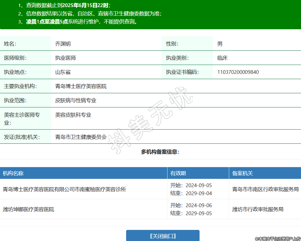 姓名:喬淵明性別:男醫(yī)師級別:執(zhí)業(yè)醫(yī)師執(zhí)業(yè)類別:臨床執(zhí)業(yè)地點:山東省執(zhí)業(yè)證書編碼:110370200009840主要執(zhí)業(yè)機構:青島博士醫(yī)療美容醫(yī)院執(zhí)業(yè)范圍:皮膚病與性病專業(yè)美容主診醫(yī)師專業(yè):美容皮膚科專業(yè)發(fā)證(批準)機關:青島市衛(wèi)生健康委員會多機構備案信息:機構名稱 有效期 備案機關 青島博士醫(yī)療美容醫(yī)院有限公司市南蜜柚醫(yī)療美容診所 開始:2024-09-05結束:2029-09-04青島市市南區(qū)行政審批服務局 濰坊坤娜醫(yī)療美容醫(yī)院 開始:2024-09-06結束:2029-09-05濰坊市行政審批服務局 -